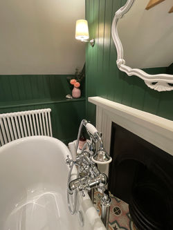A generous bathroom with a roll-top bath and large shower, a cosy lounge with a wood-burning stove, and an open-plan kitchen and dining space gives the cottage a sense of ease and understated luxury.